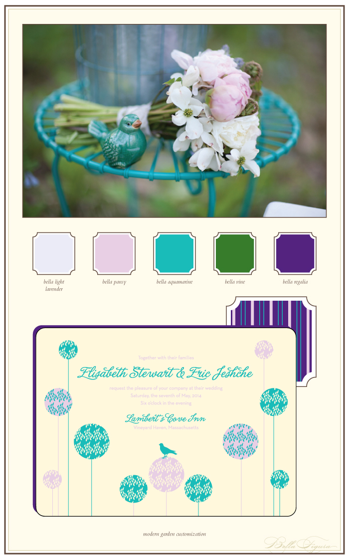 Modern garden customization = inks: aquamarine + pansy | fonts: streamline + sofia | paper: ivory | invite size: A-7 | liner: vintage stripes pattern in regalia, aquamarine & pansy ink | original design by Tara Hogan | customized by in-house designer Andrea Streeter