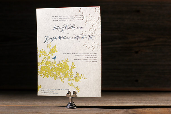 We love this striking 3-color letterpress customization of our Vendage design. Printed in mustard and Mediterranean inks paired with blind deboss, this design also showcases sophisticated calligraphy accents from Bella Figura callligrapher Debi Zeinert. The combination takes a very modern design and makes it incredibly elegant and chic, a twist we can’t help but love.