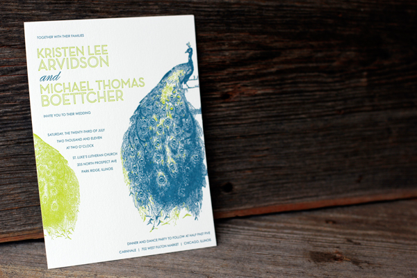 More gorgeous Mediterranean ink made an appearance with these stunning letterpress invitations in our Peacock Full design. Paired with bright spring green, this color combination is both vibrant and sophisticated. To complete the suite, pretty letterpress place cards for the reception were printed to match.