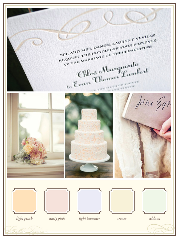 Soft, elegant and impossibly romantic we love a color palette of light peach, dusty pink, light lavender, cream and celadon to capture the timeless sophistication of our Tennyson letterpress wedding invitations. (Photo credits: wedding invitations + bouquet + wedding cake + dress with book.)