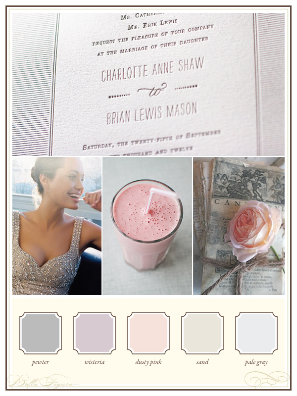 Simple and typographic, our new Collection letterpress invitations take on a sweet and romantic side when paired with pewter, wisteria, dusty pink, sand, and pale gray – perfect for a chic and elegant wedding. (Photos – letterpress invitations + Angelina Jolie + milk shake via Creature Comforts + newspaper.)