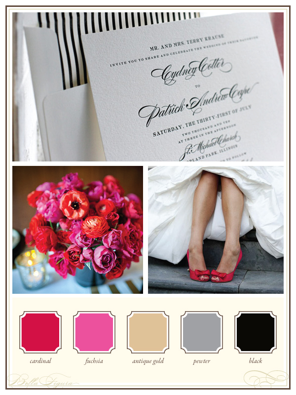 Inspired by chic black tie weddings with a touch of feminine glamor, wedding colors of fuchsia, cardinal, antique gold, pewter and black showcasing our ever popular Deveril letterpress wedding invitations. (Photo credits: wedding invitations + centerpieces + wedding shoes.)